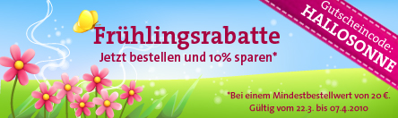 Mit dem Couponcode „HALLOSONNE” kann vom 22.3. -7.4.2010 nach Herzenslust in allen Partnershops eingekauft werden. Bei einer Mindestbestellung von nur 20€ sogar um 10% günstiger! Als kleine Inspiration für unsere Kunden, hier eine Liste ausgewählter Partnershops. Viel Spaß beim Verkaufen und Einkaufen!