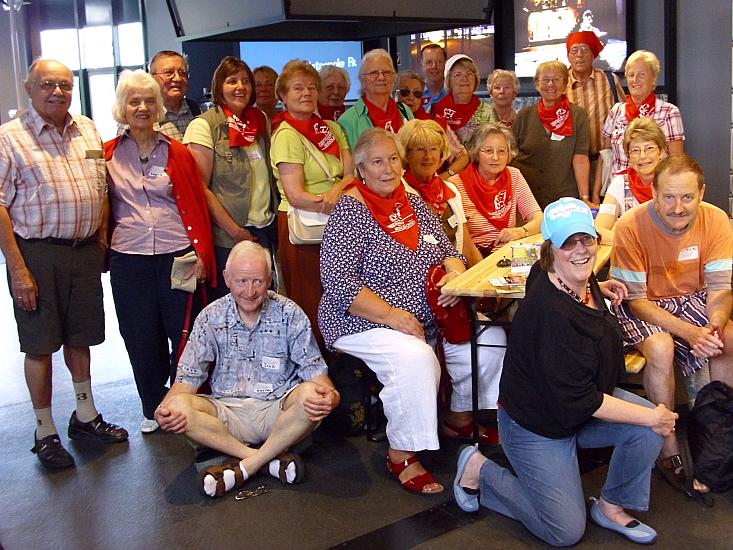 Hier ein Bild mit den deutschen und englischen Oldies mit euren bandanas beim Probesitzen auf einer Bank für das Still-Leben A40.