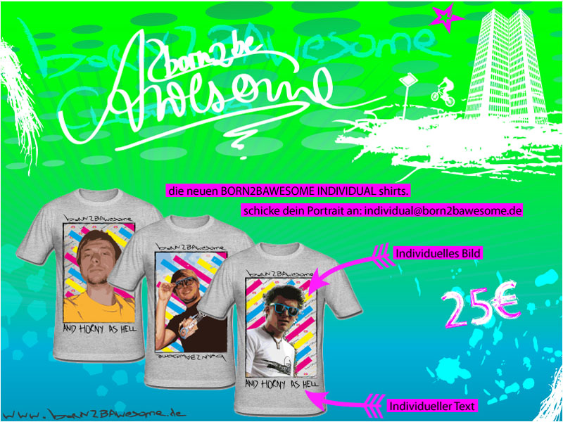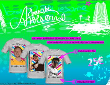 Born2BAwesome Individual ist etwas für die ganz Offensiven. Du schickst dein Foto (vorzugsweise ein Portrait) sowie deinen individuellen Slogan an individual@born2bawesome.de und bekommst dann von uns dein individualisiertes Shirt mit deinem Gesicht darauf. Das kommt ziemlich gut bei den Leuten an.
