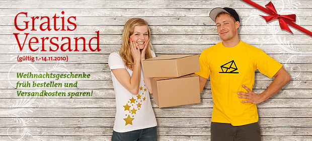 Bestellt bis 14. November von unserer reichhaltigen Auswahl an Geschenkideen und gebt den Gutscheincode SCHNELLSEIN an der Kasse ein. Damit gibts gratis Versand für Geschenke vom Baumwolllieferanten eures Vertrauens! Der Code ist gültig ohne Mindestbestellwert und kann in allen Spreadshirt Shops eingelöst werden.