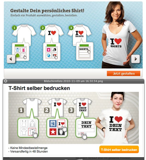 Spreadshirt scheint alles richtig zu machen, dass die Seite selbst anderen Produzenten gefällt. Kopie ist die höchste Form der Anerkennung, sagt selbst ein großer Automobilkonzern. Herzlichen Glückwunsch.