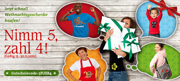 Wir unternehmen dieses Jahr einen neuen Versuch, uns und euch mehr Disziplin den frühen Vogel schmackhaft zu machen: Ab sofort und bis zum 30. November könnt ihr eure Geschenke extrem günstig und vor allem rechtzeitig bestellen. Dazu kauft ihr 5 Produkte, zahlt aber nur 4. Das ist der Deal: vom T-Shirt über die Krawatte über die Notebook-Tasche oder das Hunde-Bandana — alles ist drin. Einfach am Ende Eurer Bestellung den Gutscheincode 5FUER4 angeben, schon wandert das günstigste Produkt gratis in euren Briefkasten. Der Gutschein ist gültig bei Spreadshirt und in allen Spreadshirt Partner-Shops.