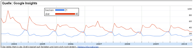 Heute Morgen hatte ich Bauchschmerzen. Warum? Zuviel Lebkuchen! Weihnachten steht also an. Dazu erst mal eine amüsante Erkenntnis: Erst backen die Leute wie wild, danach geht’s auf Diät. Für Google sieht das so aus: