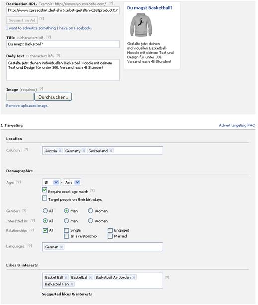 Als letztes musst Du die Zielgruppe definieren. Willst Du Männer oder Frauen ansprechen? Verliebte oder Singles? Und ganz wichtig: Welche Interessen sollen die Leute haben? Bei Facebook hängen die Kosten für einen Klick sehr stark von der Klickrate Deiner Anzeige ab. Will sagen: Umso mehr Leute, die Deine Anzeige sehen, diese auch anklicken, desto weniger bezahlst Du für einen Klick. Relevanz ist also der wichtigste Erfolgsfaktor. Auf der anderen Seite bringt es natürlich auch nichts, extrem detaillierte Zielgruppen mit jeweils 50 Leuten zu bilden (es sei denn man hat viel Zeit). Es gilt also einen Mittelweg zu finden. Ich denke, weniger als 500-1000 Leute sollte eine Zielgruppe auf keinen Fall haben. Ein Beispiel: