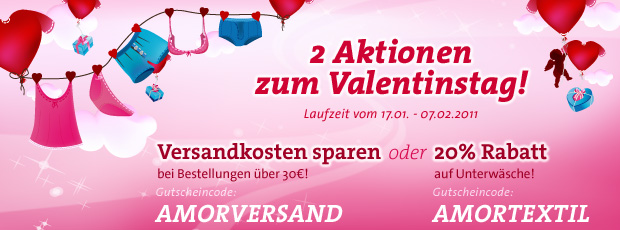 Nochmal das Thema Valentinstag, jetzt kurz zur “Auffrischung”: Noch eine Woche läuft unsere Valentinstag Promotion. Dabei habt ihr die Wahl zwischen zwei Aktionen. Einmal gibts kostenlosen Versand für Bestellungen über 30 EUR. Nutzt dafür den Code AMORVERSAND. Bei der zweiten Aktion spart ihr 20% beim Kauf von Unterwäsche für Frauen und Männer. Nutzt dafür den Code AMORTEXTIL.