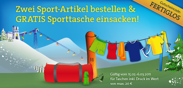 Eine Woche lang könnt ihr noch unsere Sportaktion nutzen bzw. in eurem Shop bewerben. Und das geht so: einfach zwei Produkte aus unserer neuen Sportkategorie aussuchen, und danach eine Sporttasche. Wenn ihr dann den Gutscheincode FERTIGLOS im Warenkorb eingebt, schreiben wir euch bis zu 20 EUR für die Tasche gut. Der Code ist gültig bis 6. März bei uns und in allen Spreadshirt Shops.