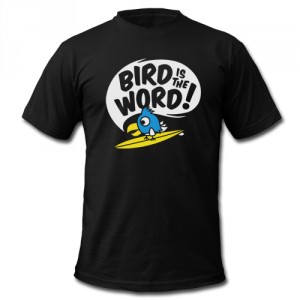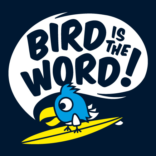 was bietet sich da mehr an als ein surfender vogel und der textzeile »bird is the word«.* umsetzten werde ich das ganze als vektordesign, einfach weil ich die vorteile dieses formats zu schätzen weiss: verlustfreie skalierbarkeit und der kunde kann die farben später selbst wählen.