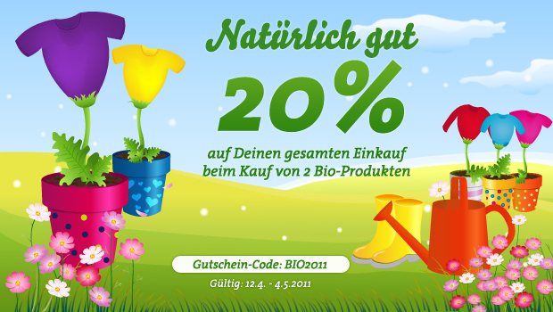Biologisch zertifizierte Produkte sind gut für die Haut und zur Natur. Passend zum “Earth Day Monat” April haben wir daher wieder eine Kampagne, bei der ihr euch (und Mutter Natur) etwas Gutes tun könnt: Bis zum 04. Mai 2011 erhaltet ihr 20% Rabatt auf euren Einkauf, wenn ihr mindestens zwei Bioprodukte in den Warenkorb legt. Das heißt, man spart auch bei allen anderen Shirts, Hoodies, Jacken, Hosen, Taschen, Schürzen etc. solange eben 2 Bioprodukte gekauft werden. Wenn ihr wollt, könnt ihr z.B. auch bei mehreren Partnern einkaufen, denn die Aktion ist natürlich für alle Spreadshirt Shops gültig. Der Gutscheincode, den ihr dafür bei der Bestellung eingeben müsst, lautet BIO2011.