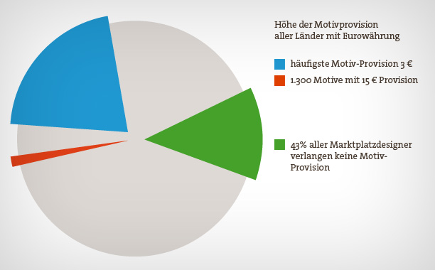 Und jetzt das wohl spannendste Thema für einige von euch – PROVISION: Dank der selbst zu wählenden Motivprovision kann jeder Designer selbst entscheiden, wie viel Geld er für seine Motive haben möchte. 43% aller Marktplatzdesigner verzichten sogar ganz darauf. Dabei lohnt sich das Geschäft mit den T-Shirts. Im letzten Jahr zahlte Spreadshirt erstmals mehr als 1 Million Euro Provision an Marktplatzdesigner aus. Die durchschnittliche Motivprovision in Europa liegt bei 3,16 €. Krumme Summen sind aber eher unbegehrt. Mit 21% ist 3,00 € der am häufigsten geforderte Betrag. 94% aller Designs in Europa liegen unter 5,00 € — die Anzahl der Motive mit einer höheren Provision ist verschwindend gering. Schaut man sich die etwas näher an, ist der Anteil der Motive, die auf den von Spreadshirt festgelegten Höchstbetrag von 15 € gesetzt wurden, überraschend hoch. Wenn schon, dann gleich richtig werden sich da wohl einige gedacht haben. Besonders viele Designs mit einer Provision über 10 € wurden seit Januar 2010 allerdings nicht verkauft. Ihr könnt ja mal raten, wie viele …