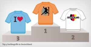 Ohne NACHFRAGE nützt das beste Angebot nichts. Um einen Überlick über das Verhältnis zwischen Angebot und Nachfrage zu bekommen, haben wir die Anzahl vorhandener Motive und die seit Januar 2010 eingegebenen Suchbegriffe gegenübergestellt. Der in Deutschland am häufigsten gesuchte Begriff ist Handball vor den zweit- und drittplatzierten Deutschland und I love. Die Briten sind noch heimatbewusster und tippten am häufigsten England und UK in das Suchfeld. Nun müsste man ja davon ausgehen, dass demensprechend viele Motive in der Kategorie Geographie zur Verfügung stehen. Gemessen an der reinen Anzahl der Motive reicht es für die Geographie sowohl in Europa als auch in Nordamerika allerdings gerade einmal für den 7. Platz. Sollte sich hier eine Marktlücke kreativer Ländershirts auftun?