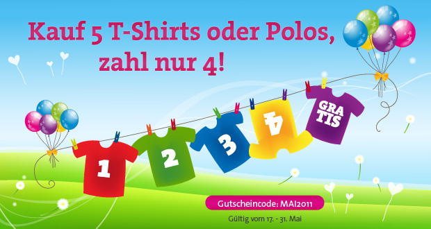 Dazu gebt ihr bei eurer Bestellung im T-Shirt Designer oder im Spreadshirt Shop eurer Wahl einfach den Gutscheincode MAI2011 ein — wir reduzieren jeweils das günstigste Produkt.
