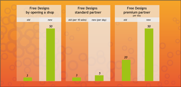 Ein Kontingent von 50 Motiven ist für jeden Spreadshirt Partner ab sofort möglich. Wenn dieses verbraucht ist, gibt es ein Kontingent von 5 Motiven pro Tag für Standard Partner und 50 pro Tag für Premium Partner. Dabei ist es egal ob es sich um Digital- oder Vektormotive handelt und ob bereits etwas verkauft wurde oder nicht.