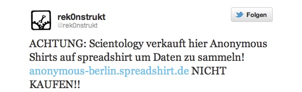 Auf Twitter und per E-Mail wurden wir heute morgen auf einen Shop aufmerksam gemacht, dessen Impressumsangaben sich mit der von Scientology Berlin überschnitten und in dem Anonymous Shirts angeboten wurden.