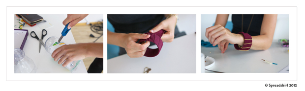 Ob der Armreif euer dezenter Begleiter wird oder zum absoluten Höhepunkt eures Outfits, entscheidet ihr selbst. Das Grundkonzept ist simpel: eine Plastikflasche mit einem breiten Streifen T-Shirt Stoff umwickeln. Dazu Boden und Hals der Flasche abschneiden, T-Shirt Farbe auswählen und den Stoff beim Umwickeln an einigen Stellen mit Textilkleber fixieren. Im kreativen Teil könnt ihr euch jetzt mit Knöpfen, Nieten und Glitzersteinen austoben, oder den Armreif mit einer schlichten Perlenkette vollenden.