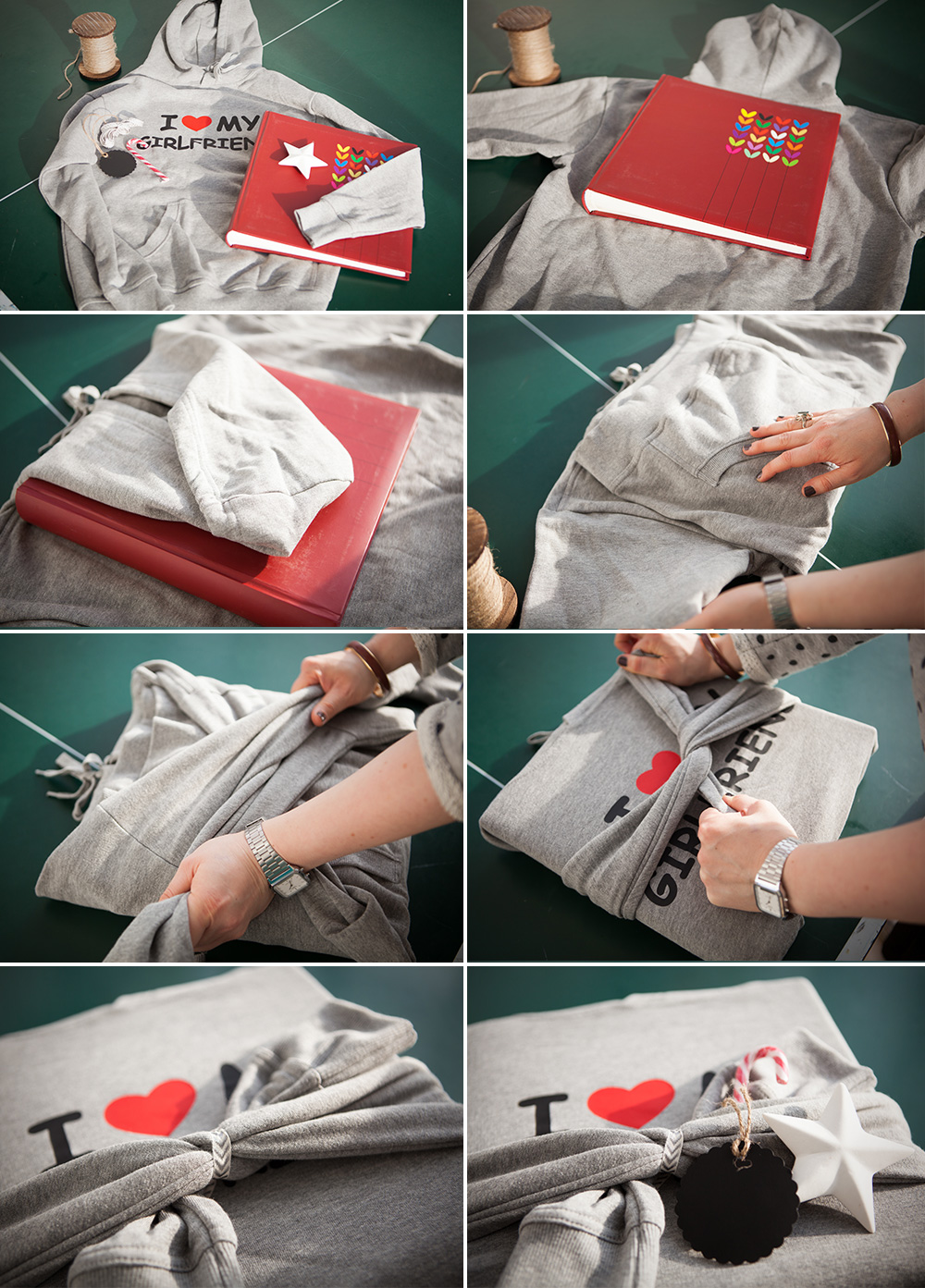 Den Hoodie auf der Vorderseite ausbreiten und das Geschenk am oberen Rand unter der Kapuze anlegen. Die Kapuze nach unten auf das Geschenk klappen. Danach das untere Ende nach oben klappen und die Ärmel überkreuzen. Zuletzt den Hoodie mit Geschenk umdrehen, die Ärmel auf die Vorderseite um das Geschenk herumschlagen und einen Knoten oder eine Schleife bilden.