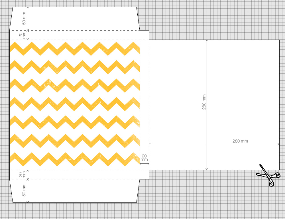 Nimm für alle weiteren Schritte diese Skizze zu Hilfe. Die gestrichelten Linien sind Faltlinien. Schneide den Karton entsprechend aus und falte ihn entlang der Faltlinien. Bestreiche die beiden schmalen Seitenlaschen mit Kleber und füge Vorder- und Rückseite vorsichtig zusammen. Nun kannst Du Dein gefaltetes Shirt wie eine Schallplatte in die Hülle schieben.