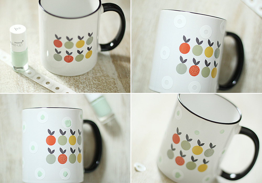 • Klebe die Lochaufkleber nach Lust und Laune auf die Tasse ohne zu fest zu drücken.