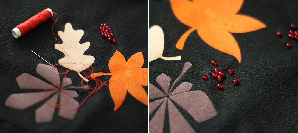 Sticke die Perlen eine nach der anderen auf, indem du sie um die aufgedruckten Blätter gruppierst.