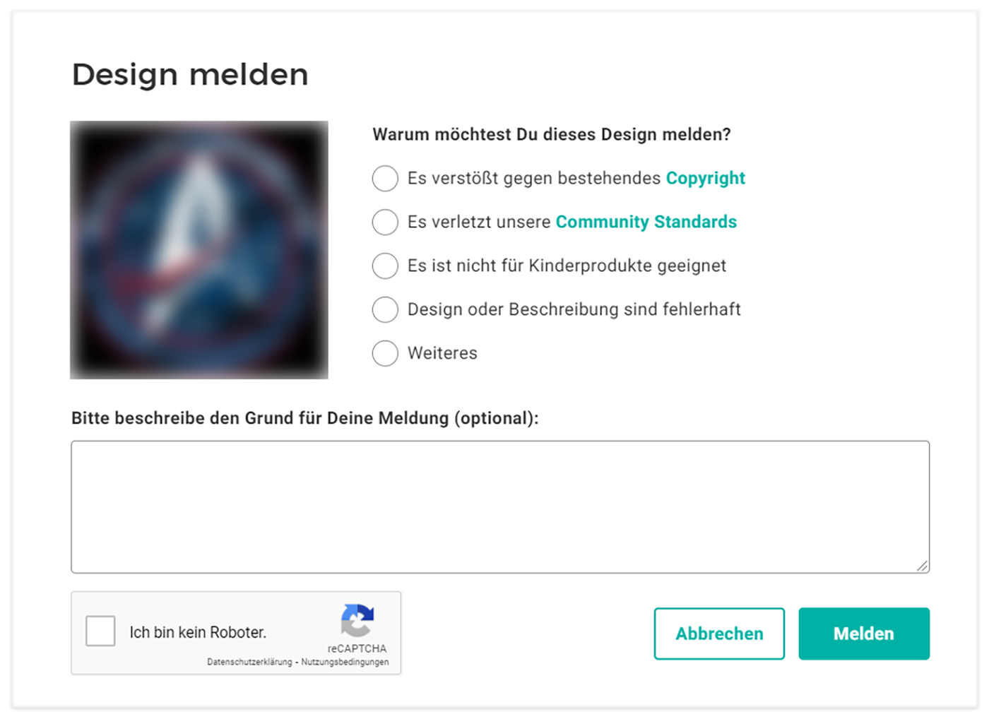 Finde ich sehr gut, dass ihr zum Design melden nun das Meldeformular eingeführt habt. Zumal ihr vor einiger Zeit die Design-IDs unter den Designdetails entfernt habt und sich das Melden von kopierten Designs mit dem bloßen Link auf eine Emailadresse schwieriger gestaltete. Hab eben auch schon davon Gebrauch gemacht. 😉