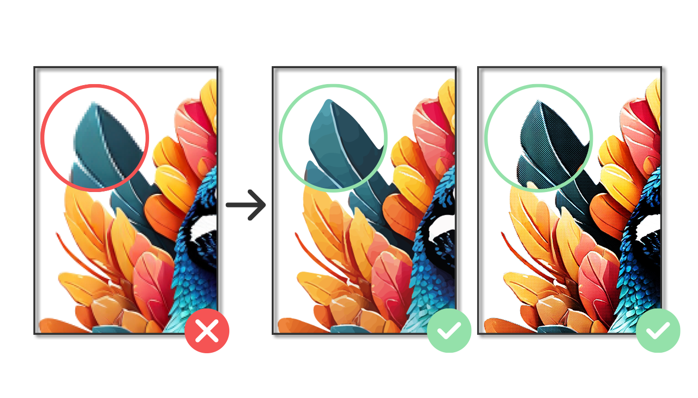 Um dies zu vermeiden, empfiehlt es sich, die Designs von vornherein in einer höheren Auflösung zu erzeugen – idealerweise mit einer Kantenseite von mindestens 1000 bis maximal 4000 Pixeln. Eine sinnvolle Alternative wäre ansonsten die nachträgliche Vektorisierung der Designs oder deren Umwandlung in ein Halbtonraster, welches sich besonders für halbtransparente Bereiche, bspw. an den Design-Rändern, eignet.