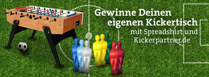 Wir verlosen nur noch heute gemeinsam mit Kickershirt.de einen Kickertisch zum selbstgestalten im Wert von 599€. Einfach Deinen besten EM Spruch, oder Deine beste EM Zusammenfassung auf ein Shirt packen und gewinnen! Mehr Infos gibt’s auf unserer Facebook Seite und in der Gewinnspiel App! Die Aktion läuft noch bis heute 23:59 Uhr. Also schnell, schnell!
