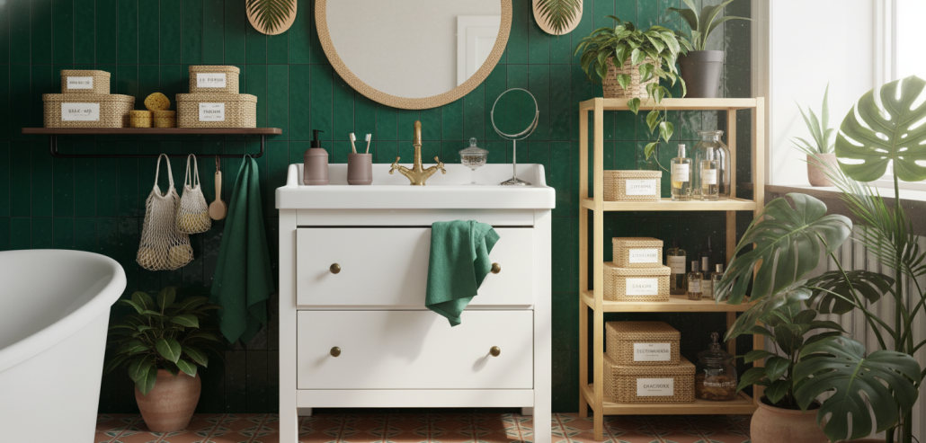 Auf dem Foto mit dem grünen Badezimmer siehst Du eine wunderschöne Umsetzung: Rattankörbe, Labels im gleichen Stil, Pflanzen drumherum.