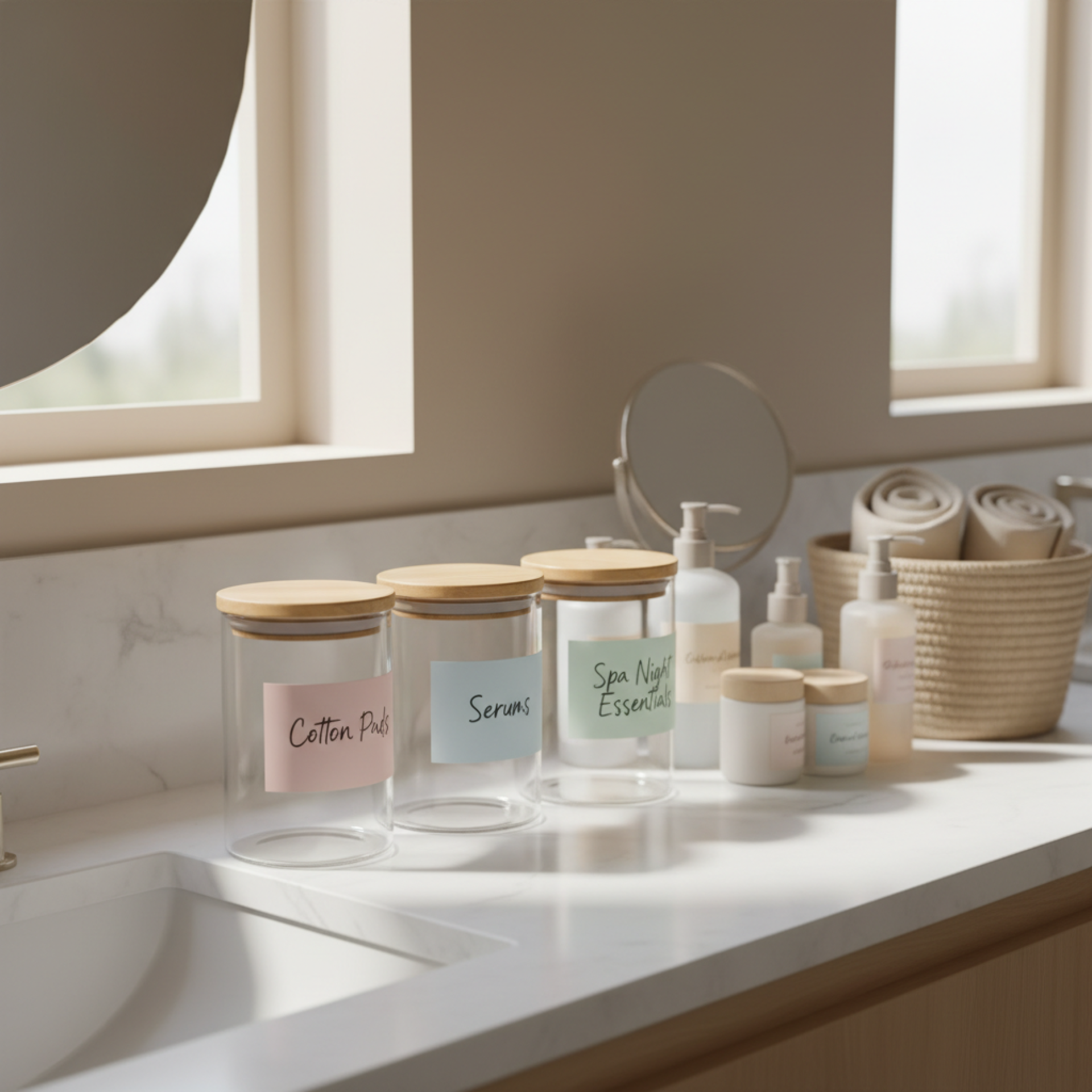 Eine aufgeräumte Selfcare-Station wirkt wie ein kleiner Spa-Moment zuhause. Sticker helfen Dir, Behälter zu beschriften und alles übersichtlich zu machen. Genau so, wie Du es auf dem unteren Bild sehen kannst: Glasbehälter mit Holzdeckel, zarte Sticker in Pastellfarben, klare Beschriftung.